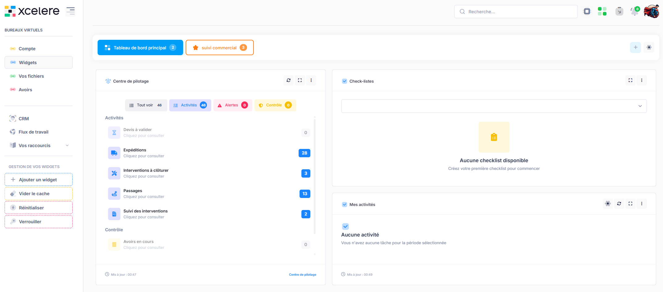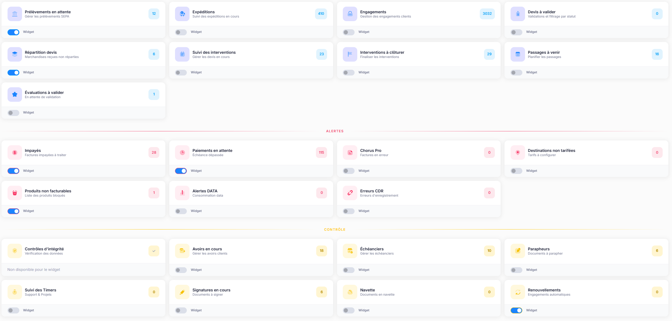 Centre de pilotage central avec widgets personnalisables. Chaque utilisateur construit son propre tableau de bord.