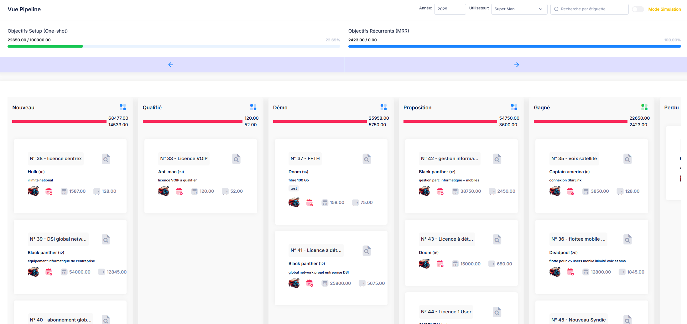 Gestion des opportunités, automatisation marketing par statuts, suivi client complet et historique des interactions.